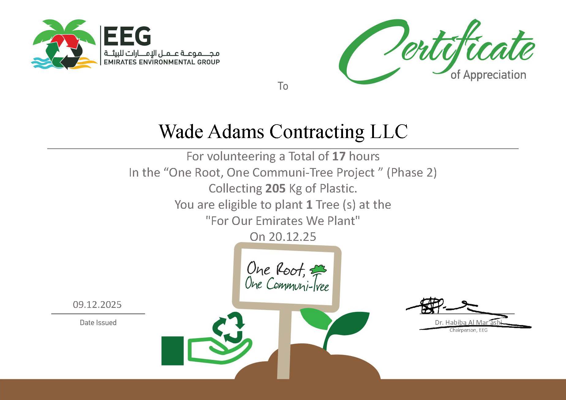 Emirates Environmental Group (EEG) in recognition of our efforts, presented Wade Adams Contracting with a Certificate of Appreciation and provided the opportunity to plant a native sapling in the name of the company at Al Munai, Ras Al Khaimah, as part of its Annual Tree Plantation Programme.